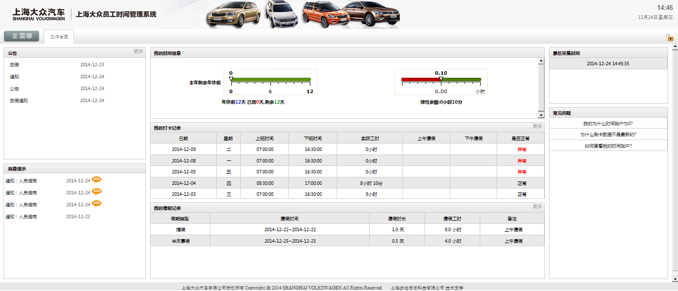 我公司2014年承建上海大众考勤管理系统,系统使用对象为上海大众旗下三个工厂10万余人,我公司研发团队2014年6月进驻上海大众总部进行系统研发,年底系统成功上线,系统至今已经稳定运行3年;期间我公司研发团队严格按照上海大众的项目过程管理规范,并与SAP团队协作,完成了考勤系统与SAP人事系统的对接,研发实力得到了大众公司领导的高度好评。